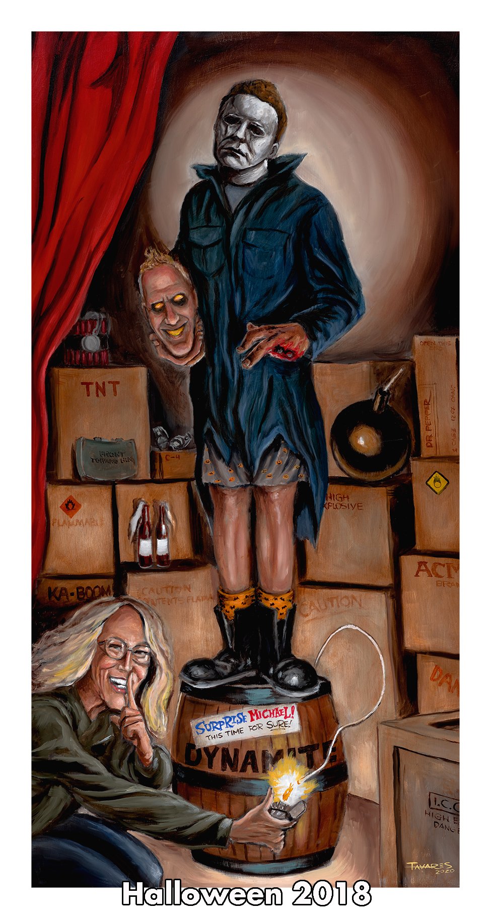 It's the perfect mashup of Halloween Horrors! These parodies of the stretching portraits in the Disneyland Haunted Mansion attraction depict the story of Laurie Strode and Michael Myers from four films in the "Halloween" series; "Halloween (1978)', "Halloween 2 (1981), "Halloween H20 (1998), and "Halloween 2018".