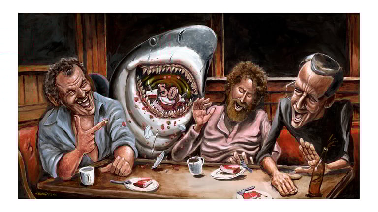 This print of my original "JAWS" inspired oil painting measures 18 x 10. It is printed on high quality photo paper. Limited to a run of 200.